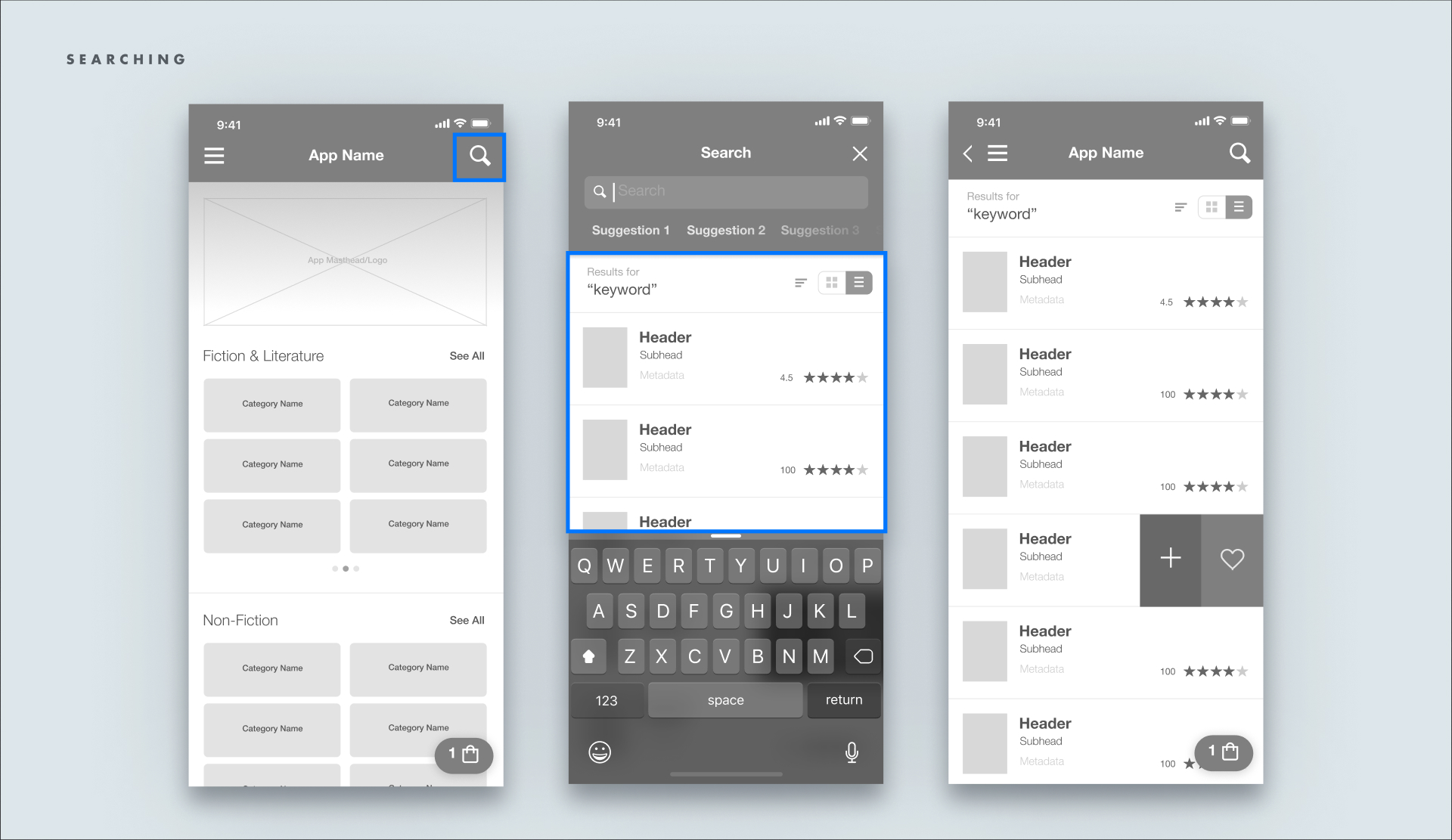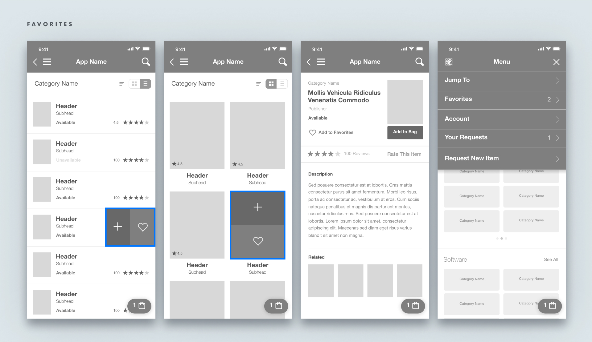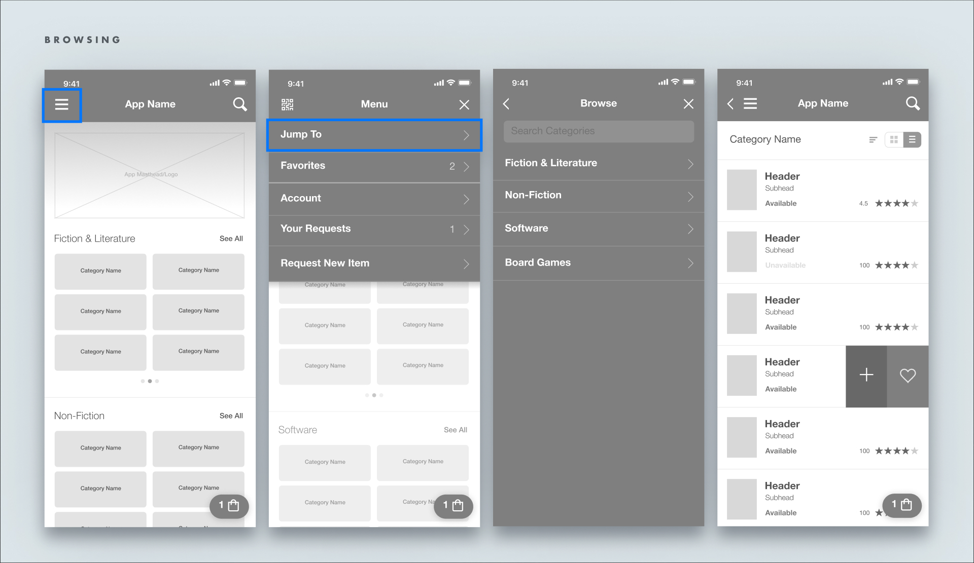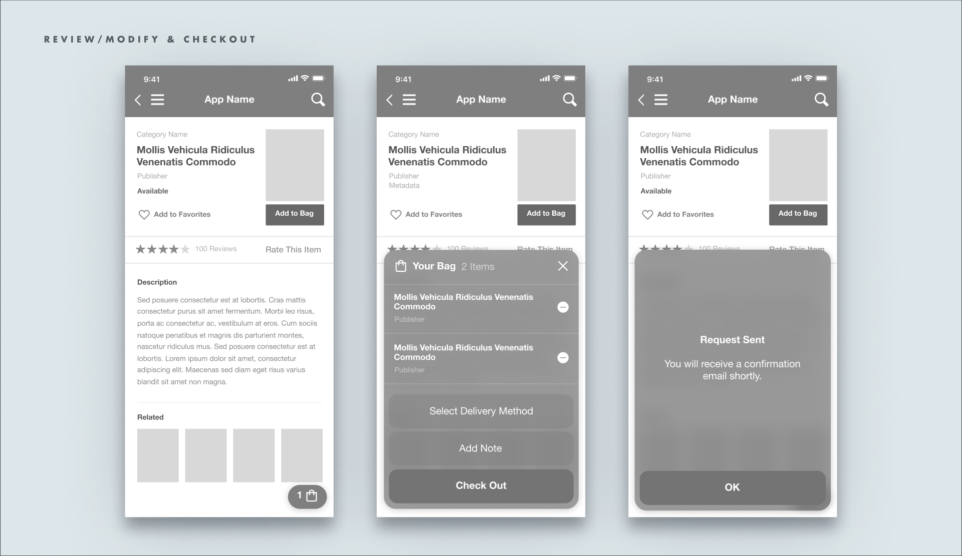 Although such an app would require a considerable amount of backend and administrative work, I wanted to focus on the end user experience for such a scenario. Primarily focusing on the users ability to navigate large amounts of content, ease of checking out or adding to favorite to check-out at a later date.