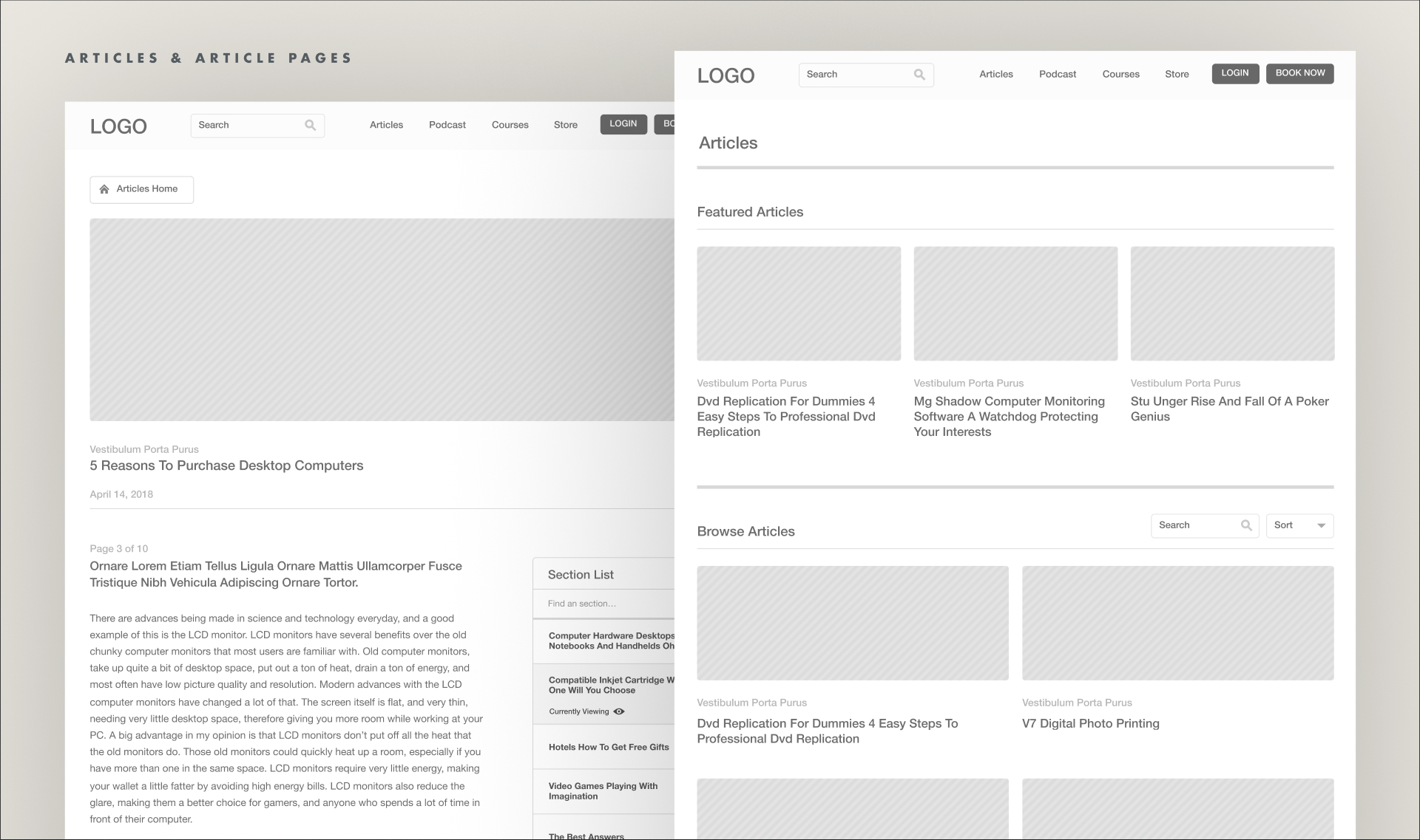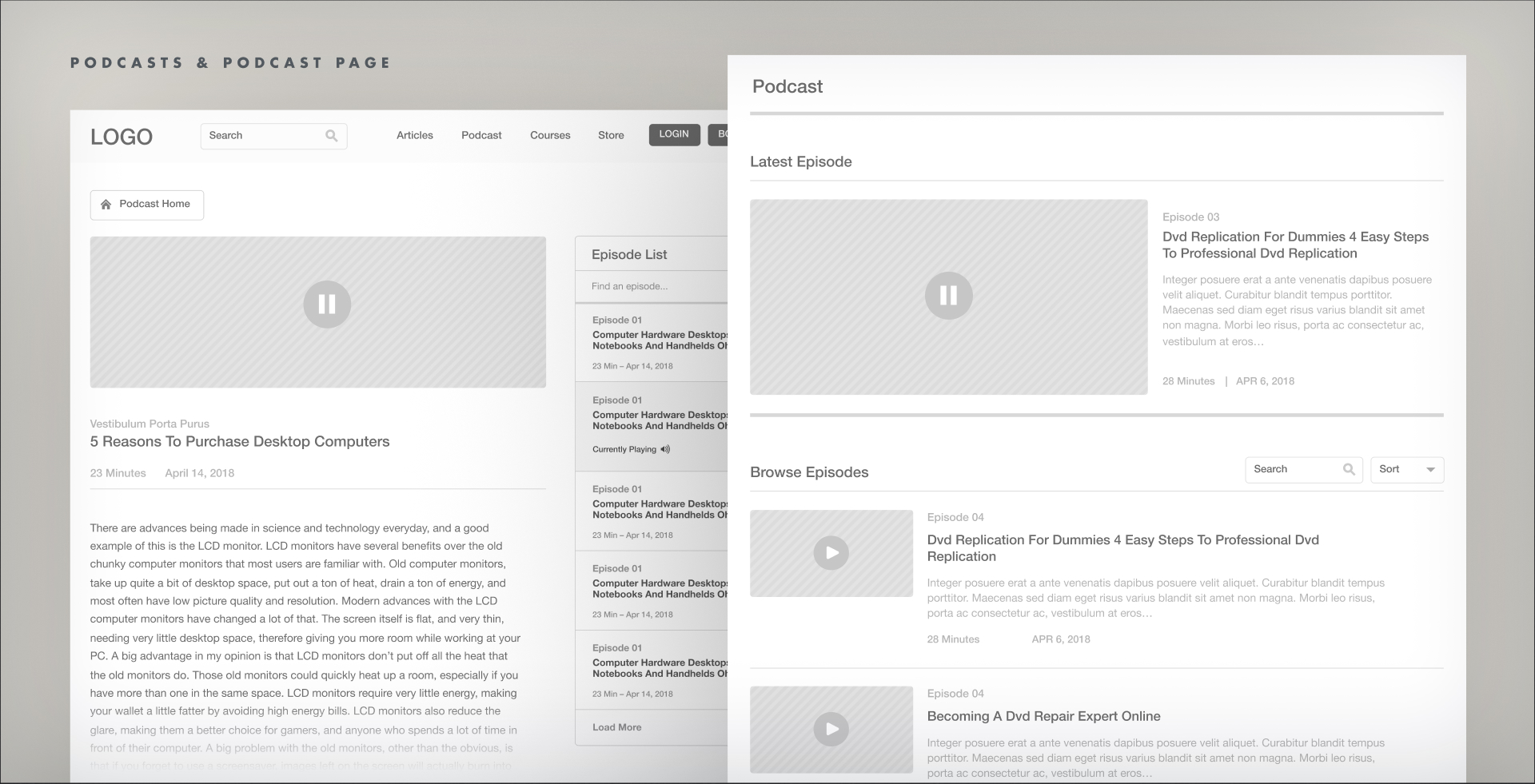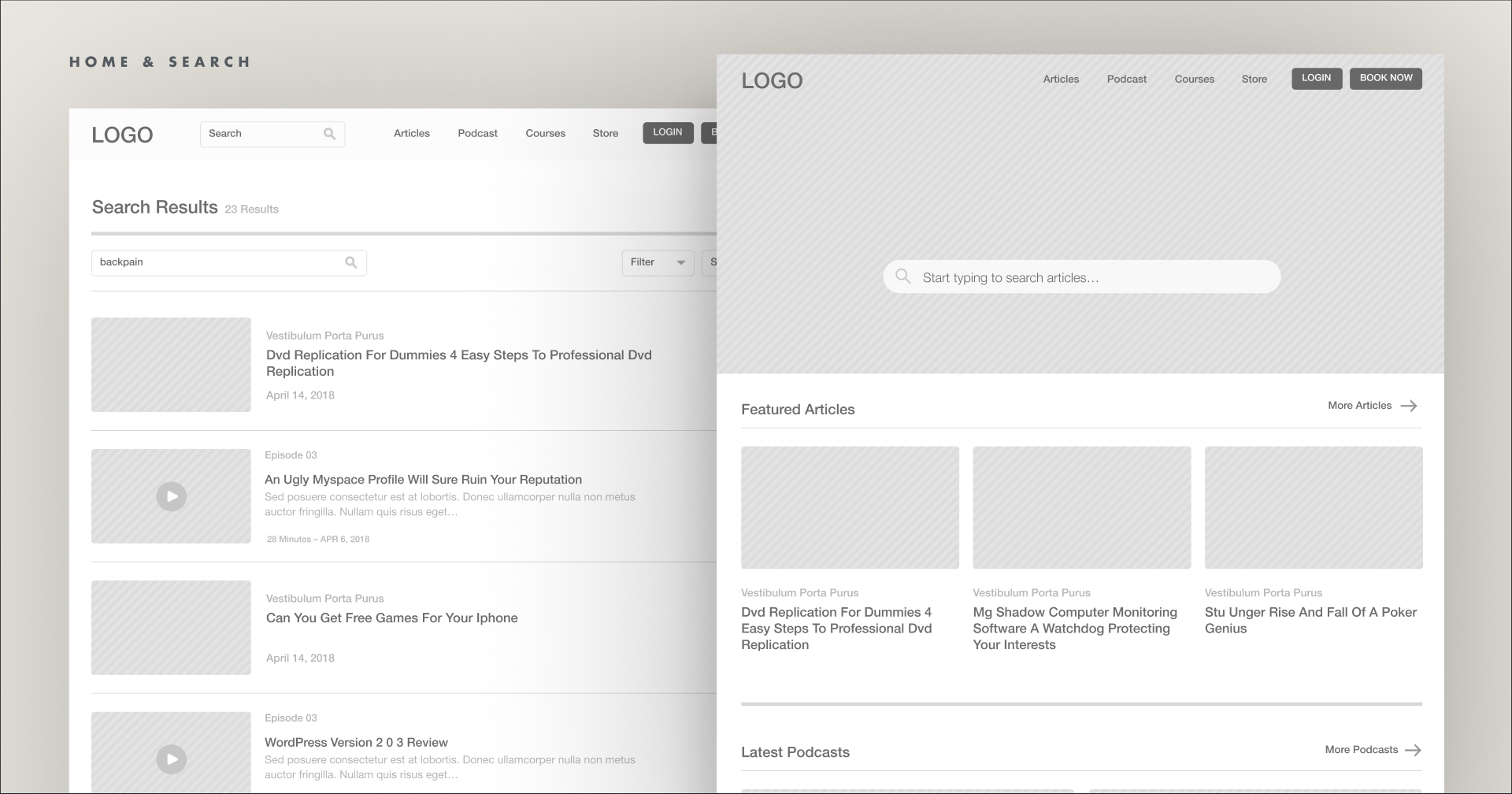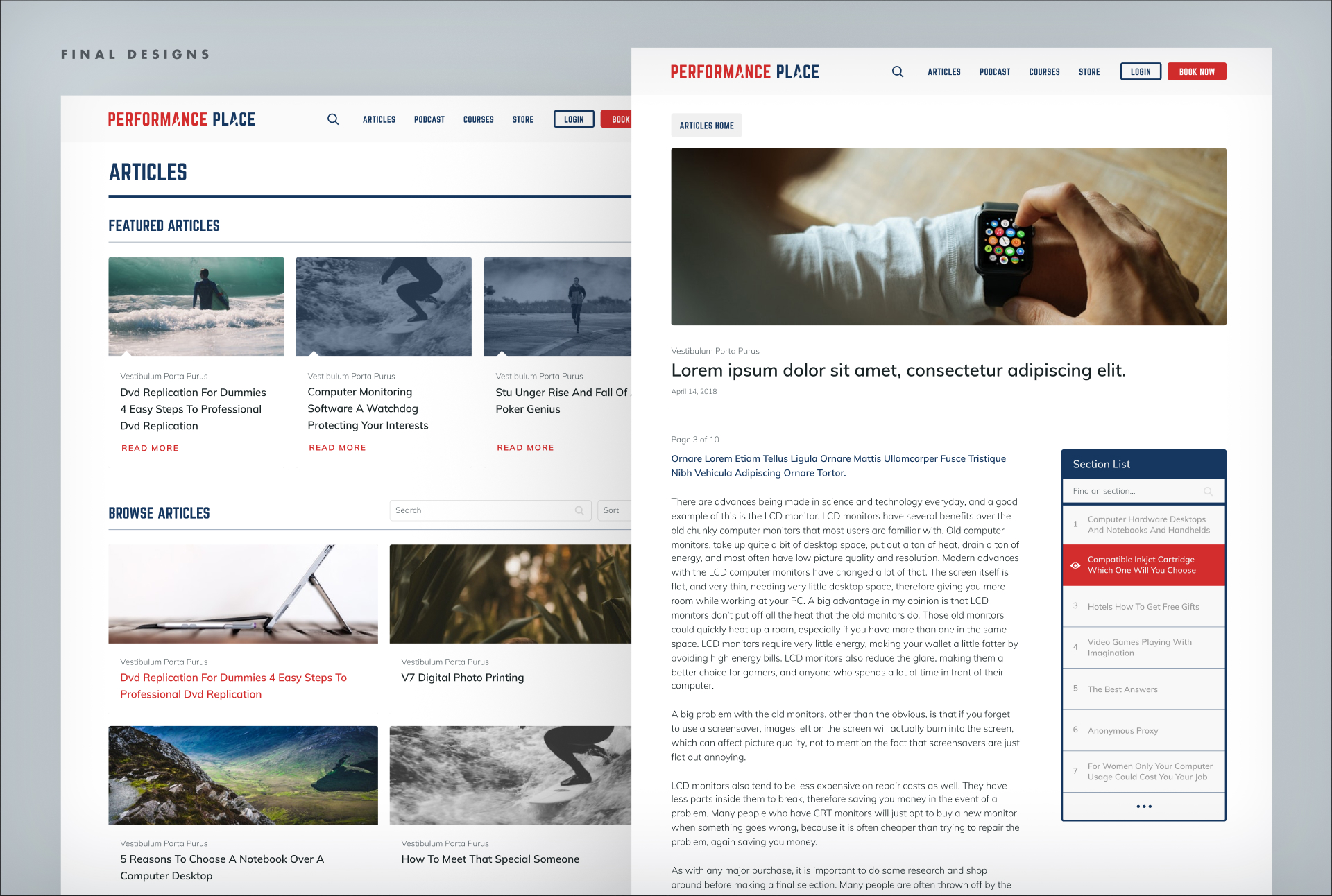 I was tasked to organize and introduce new features to Performance Place, to help direct users to content they needed. This meant creating a distinc separation between Articles and Podcasts, as well as using the home page as an aggregate and providing a search feature whenever possible.