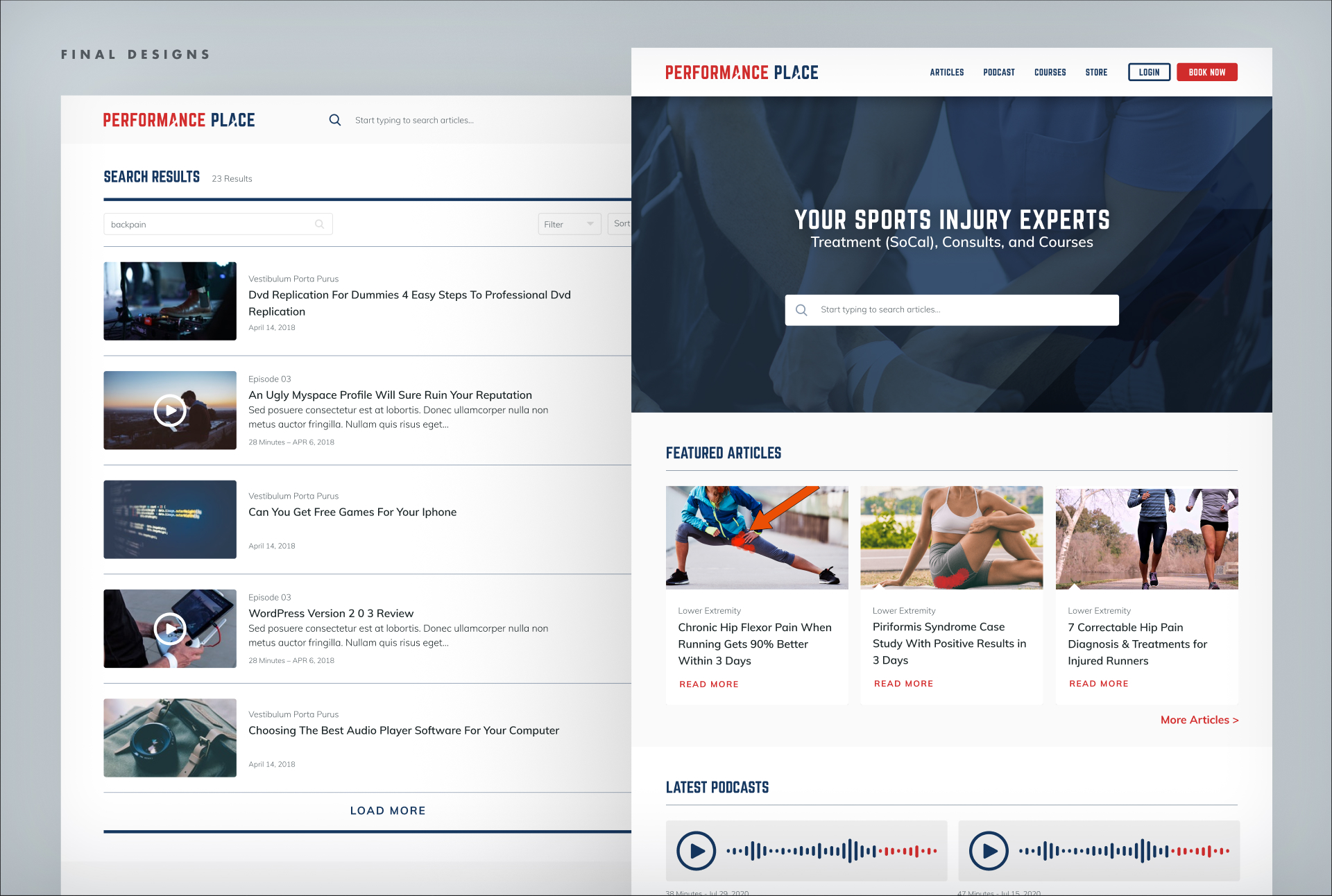 Performance Place is a website run by chiropractor and physical therapist Sebastian Gonzales who specializes in helping clients with sports-related injuries. Sebastian’s website traffic had been driven through his high candence of content, however organization of the content was lacking. The original site maintained a sort of blog-style layout but had no search and did not separate text content from blog content, but quickly was outgrown as Performance Place’s content continually grew.